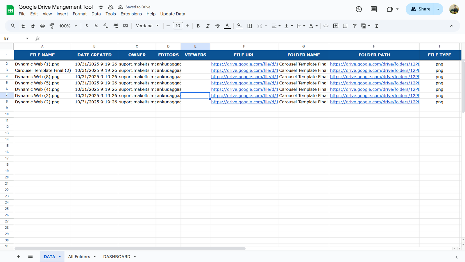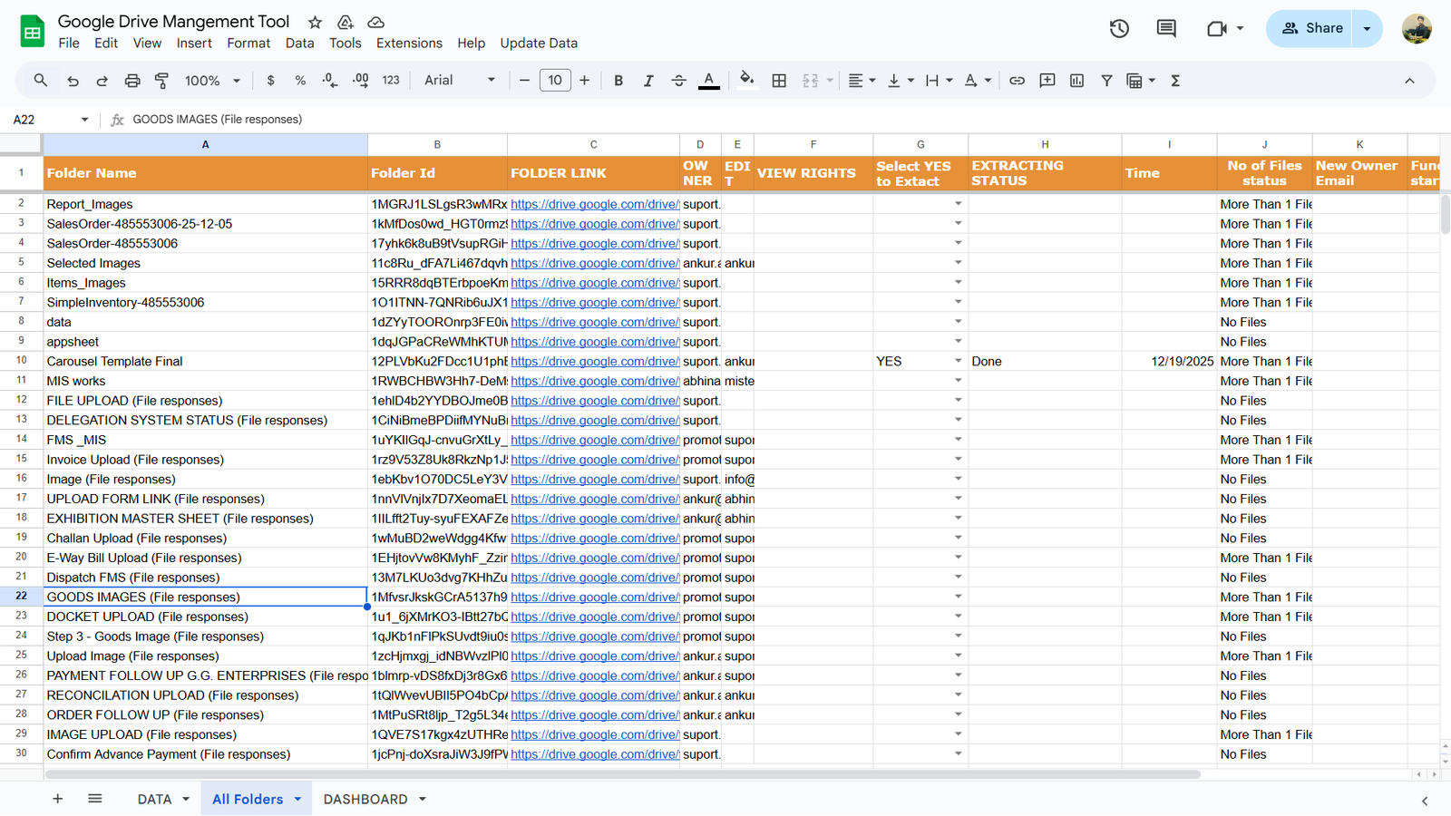We have developed a Google Sheets based automated system that continuously scans your Google Drive and updates all data in real time using Google Apps Script.